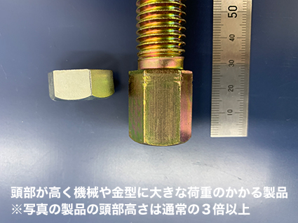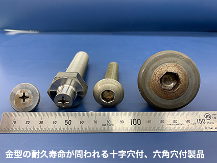 例えば据込み比4倍以上製品や大きな荷重がかかる大平頭、金型の耐久寿命が問われる十字穴付、六角穴付製品や首下寸法が短く加工が困難な製品など様々な製品を豊富な知識と経験値、技術力をもって製造しております。