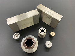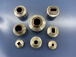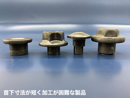 また、首下寸法が短く加工が困難な製品や頭部が高く機械や金型に大きな荷重のかかる製品、材質や形状により金型がすぐに破損してしまう製品といった様々な問題点のある製品も独自のノウハウを駆使して加工しています。トリーマーの金型はヘッダーに比べ金型寿命は短かく、金型形状の選定、機械のセッティング状態で金型の破損率や寿命が大きく左右されるため経験値が要求される工程です。