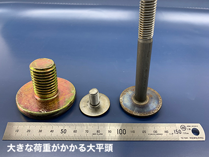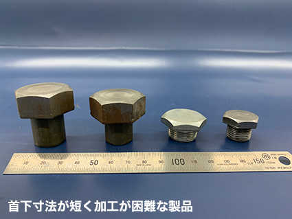 例えば据込み比4倍以上製品や大きな荷重がかかる大平頭、金型の耐久寿命が問われる十字穴付、六角穴付製品や首下寸法が短く加工が困難な製品など様々な製品を豊富な知識と経験値、技術力をもって製造しております。