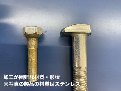 六角ボルト フランジボルト 根角ボルト 平頭ピン 丸頭ピンといった標準規格の形状はもとより、一般的にダブルヘッダーでの加工は難しいとされる形状も加工しております。