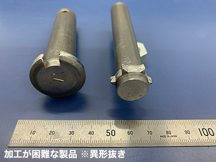 多段式の圧造機(ホーマーなど)では対応できない小ロットでの製造が可能で、さらに金型費用も安価なため低コストで加工できるという点があげられます。また当社では工程設計と金型設計を自社で行うため製造までにかかる日数を短縮することができ、短納期で製造することができます。