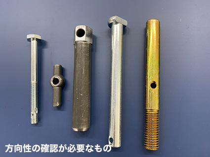 ボルトやピンの軸部に対して垂直に穴あけ加工をします。一般的な形状の平頭ピンや丸頭ピンは自動機で加工できますが、製品の中には自動供給が困難な形状や方向性の確認が必要なものが多数あります。