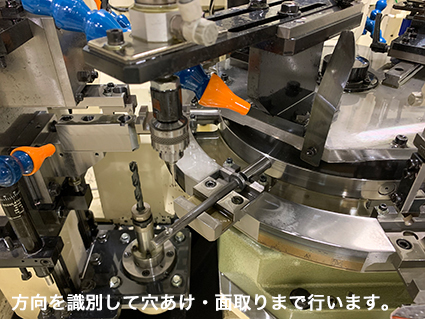 このような製品は手作業によって加工されるため生産性が悪く高コストになっておりましたが、当社ではこういった問題点を解決し、形状や方向性を「自動識別」、「自動供給」(完全自動化)して穴あけ加工できる設備が導入されております。